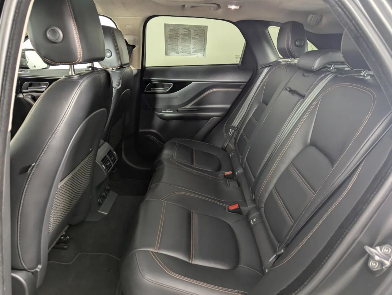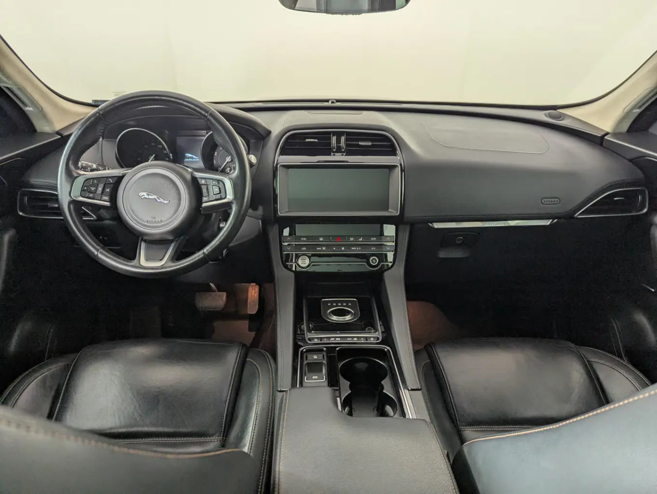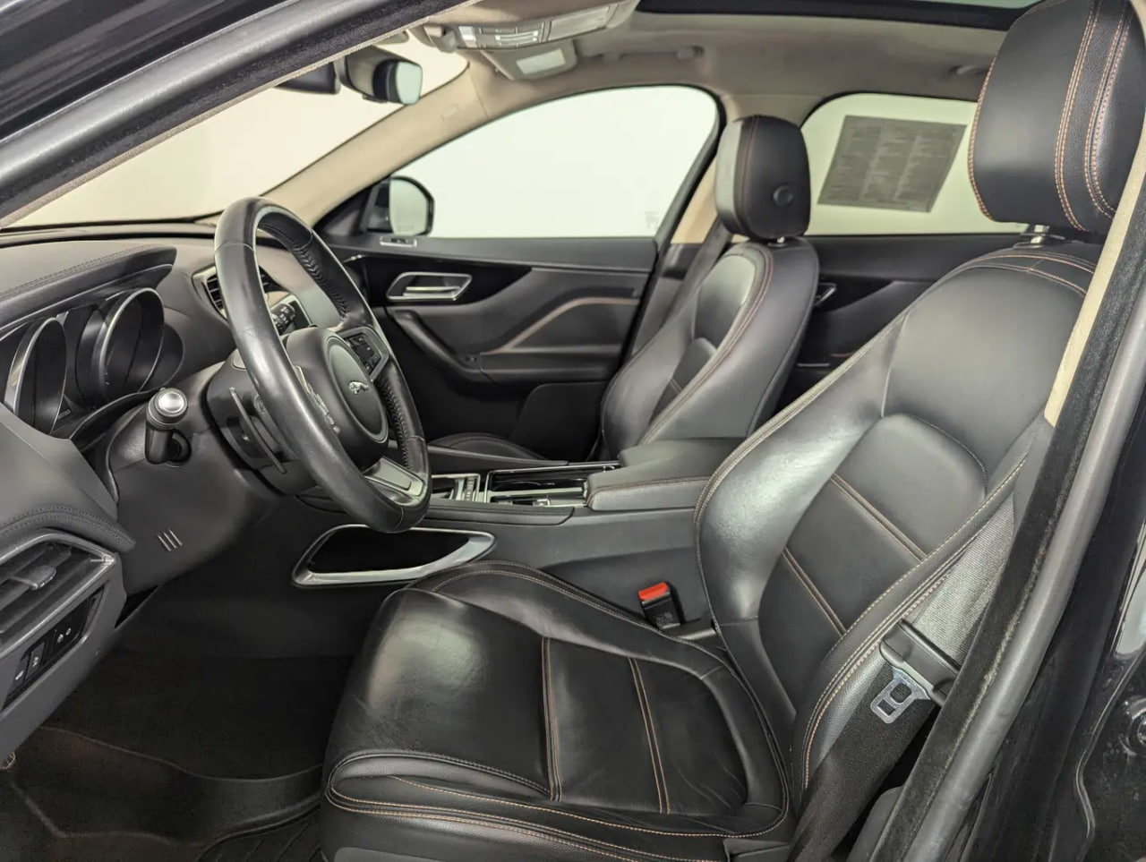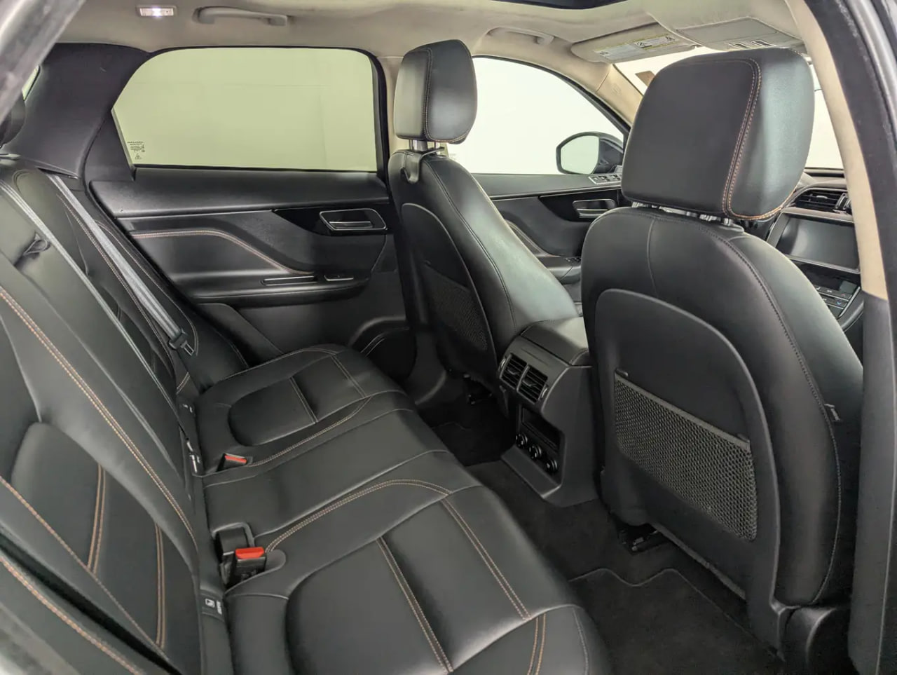 Powering this F-PACE is a 2.0L turbocharged inline-4 engine, paired with an 8-speed automatic transmission and all-wheel drive, providing balanced performance and all-season capability. The exterior is finished in Black, while the interior features an upscale Ebony leather cabin with contrast stitching, creating a sophisticated and comfortable atmosphere.