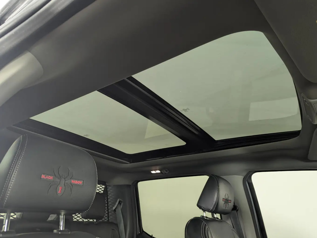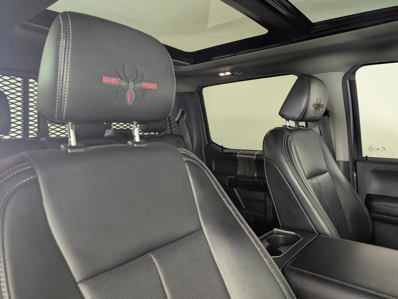 Inside the Crew Cab, the cabin offers a refined black leather interior with heated and ventilated front seats, memory seating, power-adjustable pedals, and dual-zone automatic climate control. Distinctive touches include Black Widow stitched headrests, custom Black Widow gauge cluster, ambient lighting, and a twin-panel panoramic moonroof that adds an open, upscale feel.
