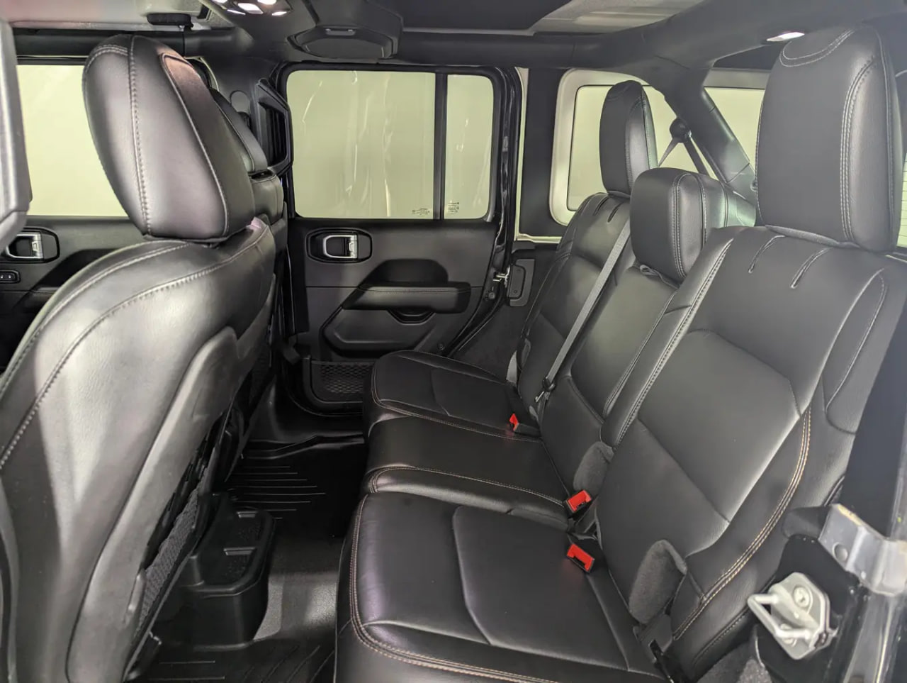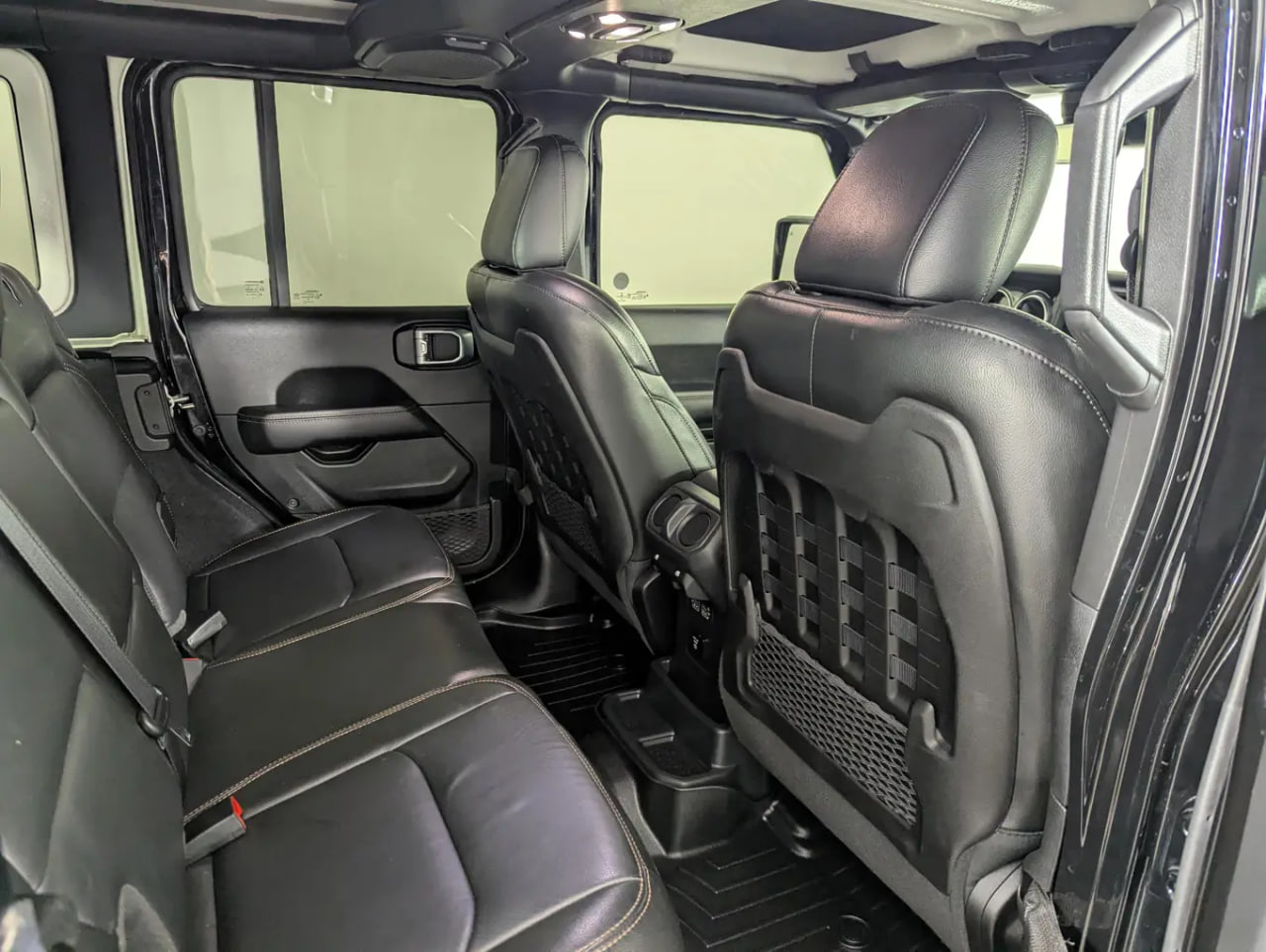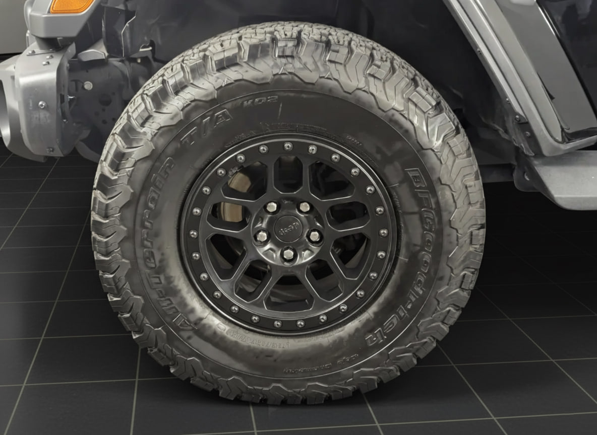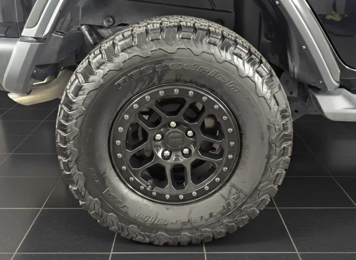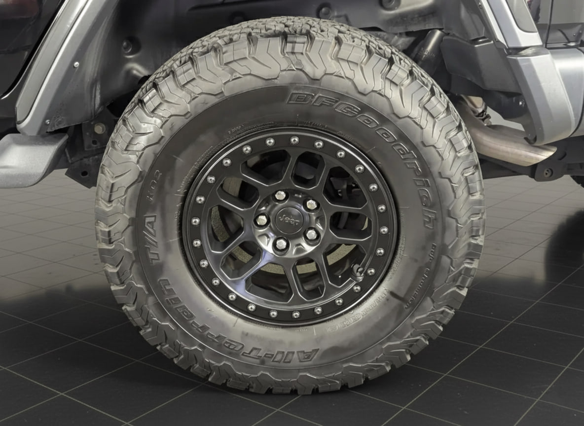 Technology and connectivity are handled by the Uconnect 4C NAV system with an 8.4-inch touchscreen, integrated navigation, Apple CarPlay and Android Auto compatibility, Bluetooth for hands-free calling and audio streaming, voice command functionality, a Wi-Fi hotspot, SiriusXM radio, and steering wheel–mounted audio controls. Sound is delivered through a premium 9-speaker Alpine audio system designed to perform in both open-air and off-road conditions. Off-road hardware includes the Rubicon 392 suspension system, Xtreme Recon Package with 35-inch tires, 17-inch bronze beadlock-capable wheels, integrated roll-over protection, Trail Rail Management System, wheel flare extensions, MOPAR hinge-gate reinforcement, running boards, and a factory tow package with Class II receiver hitch and both 7-pin and 4-pin wiring harnesses. The Dual Top Group adds a Premium Black Sunrider soft top for versatility, while rear window defrost and wiper/washer enhance year-round usability.