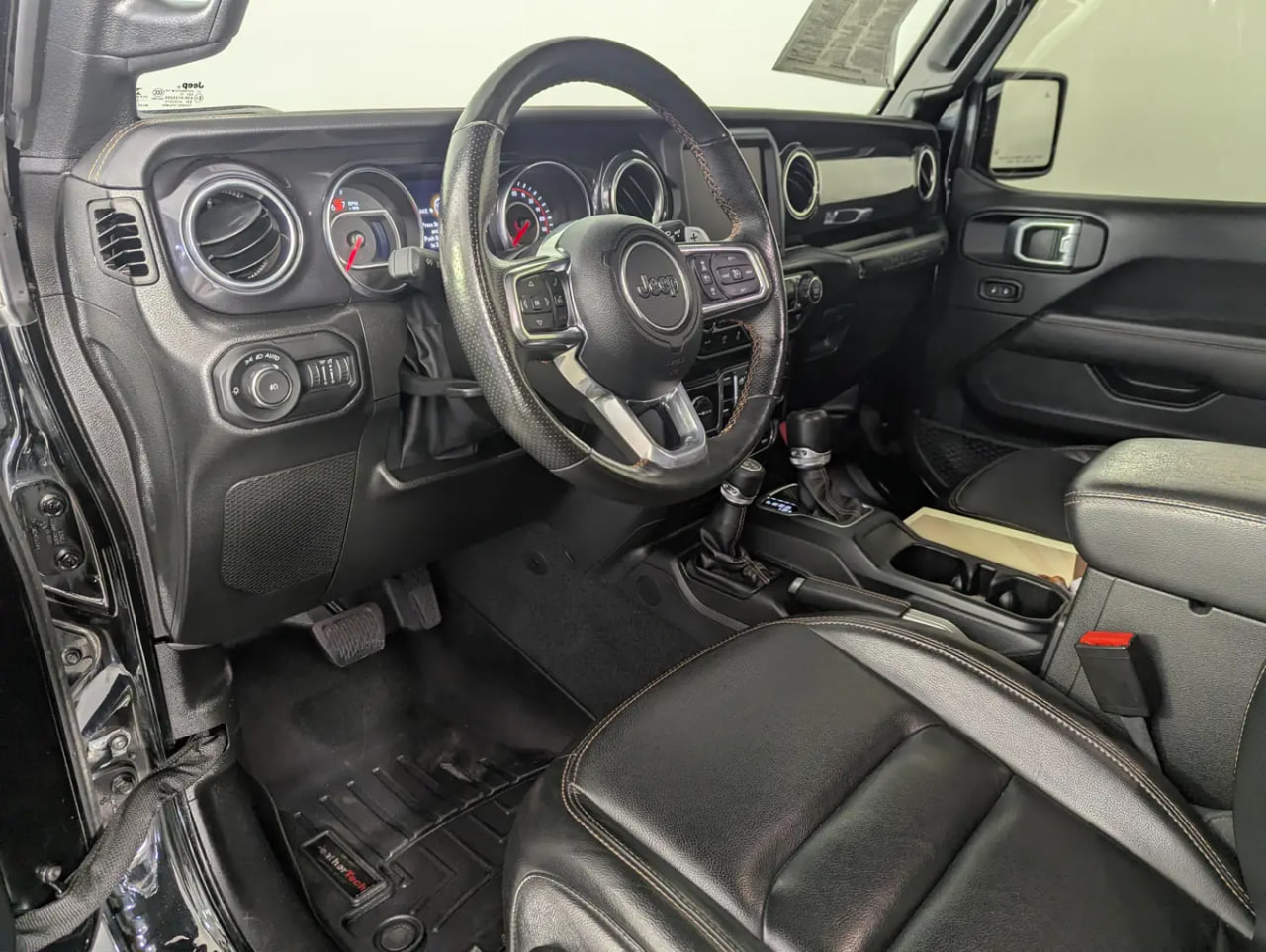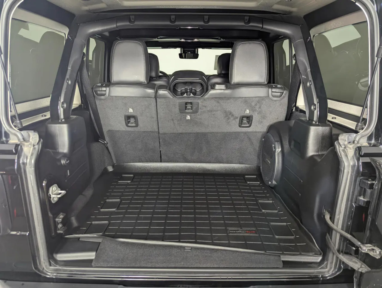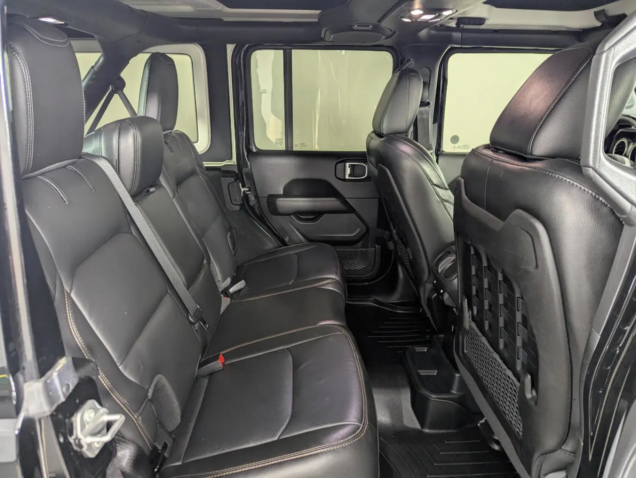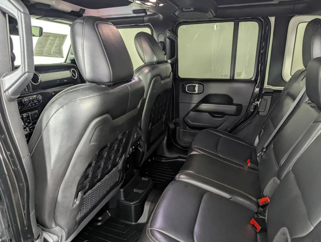 Technology and connectivity are handled by the Uconnect 4C NAV system with an 8.4-inch touchscreen, integrated navigation, Apple CarPlay and Android Auto compatibility, Bluetooth for hands-free calling and audio streaming, voice command functionality, a Wi-Fi hotspot, SiriusXM radio, and steering wheel–mounted audio controls. Sound is delivered through a premium 9-speaker Alpine audio system designed to perform in both open-air and off-road conditions. Off-road hardware includes the Rubicon 392 suspension system, Xtreme Recon Package with 35-inch tires, 17-inch bronze beadlock-capable wheels, integrated roll-over protection, Trail Rail Management System, wheel flare extensions, MOPAR hinge-gate reinforcement, running boards, and a factory tow package with Class II receiver hitch and both 7-pin and 4-pin wiring harnesses. The Dual Top Group adds a Premium Black Sunrider soft top for versatility, while rear window defrost and wiper/washer enhance year-round usability.